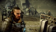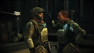 (Rico gets cut off by Narville) Narville:"I think I made it VERY clear that I don't want to hear a SINGLE WORD out of your mouth. Sev, take Velasquez and his mouth out of my face. I need the two of you on point. We're going to use the EXO to clear the route." Sev:"Yes, sir." Narville:"Pick up your feet, people! The closer we are to that crater the closer we are to home." Sev:"Try not to think about it." Narville:"Sev, get that EXO moving!"