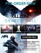 Killzone Shadow Fall ended development and "went gold" on 21 October 2013.[6] The game was released on 15 November 2013 in North America, and was released on 29 November 2013 in Europe, and on 22 February 2014 in Japan, as a launch title for the PlayStation 4. Participating retailers offered the Shadow Pack as a pre-order bonus. It included three exclusive skins for the OWL combat drone, the MP Spotlight Move (a special victory move to humiliate fallen opponents in multiplayer), and the official soundtrack.[7]