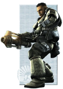 When business became profitable enough to hire a full time staff, Rico left in search of a new challenge. After a few months of aimless wandering and even drifting into petty crime, he decided to join the ISA army at the age of 18.[1] Even during training, Rico's phenomenal strength and willingness to fight set him apart from other ISA Regulars. Upon graduation he was promoted to Sergeant, and assigned to an all-rookie platoon codenamed H-Company.